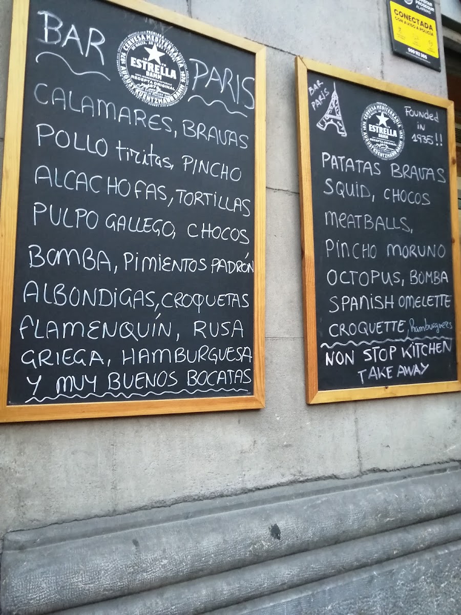 Guests often enjoy a variety of traditional tapas such as patatas bravas and tortilla de patatas, alongside heartier options like paella de marisco or the bocadillo París. The drink menu emphasizes well-poured cerveza and copas that pair effortlessly with the food, making Bar Paris a favored spot for leisurely afternoons or unhurried evening gatherings.